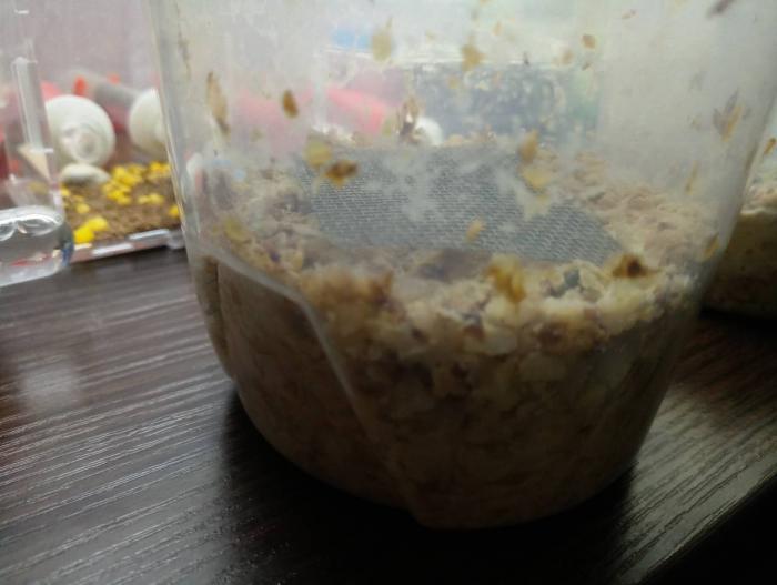 Каша с небольшой жёсткой пластиковой сеткой, что бы мухи не вязли в субстрате: