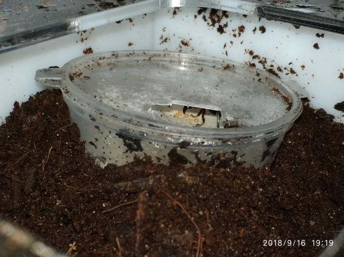 перестала засыпать поилку землей но вода полностью исчезает.толи она пьет как водохлеб либо увлажняет гнездо.сверчка кстати положила в поилку не тронув плоти.мед поедается просто на ура в чистом виде.бодра весела яички растут на глазах. одно прям золотое а второе бледно желтое пока что(новый приплод)фотография в плохом качестве и не отражает всей красоты. надеюсь не откинется внезапно как экофила=)