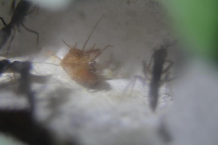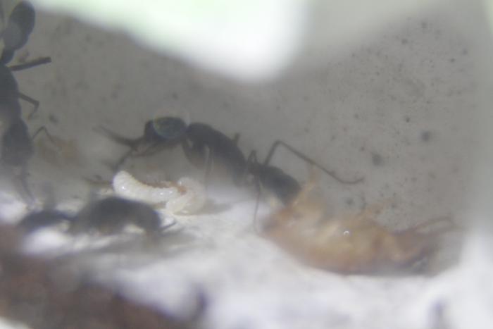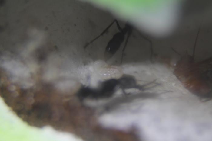 А тем временем, у веников 5 или уже 6 личинок и ещё больше десятка яиц. Одна из личинок уже крупная до половины размера взрослого муравья. От небольшого таракана теперь ничего не остаётся, съедают подчистую. Раньше выбрасывали на арену полувыеденного.