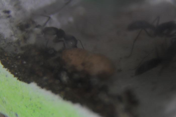 Вчера (28.11.2018) появился первый кокон. Не стал беспокоить муравьёв для съёмки, плюс конденсат на стекле, качественного фото не получилось.
