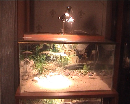 Живут бегунки в гипсовом формикарии вертикального типа. Арена сделана и оформлена в виде аквариума. Формикарий находится под задней частью арены и соединён с ней отверстием. Формикарий я закрываю черной бархатной занавеской, чтобы свет не беспокоил муравьев. Арену подсвечиваю тремя галогеновыми лампами. Ими и обогреваю.