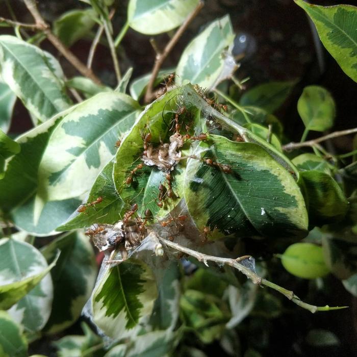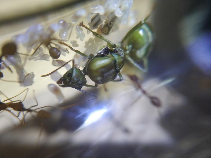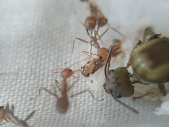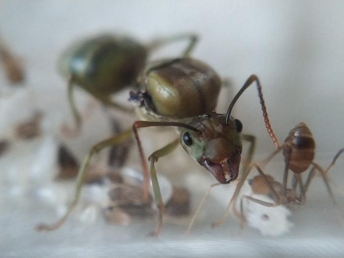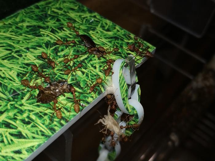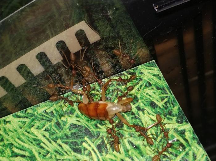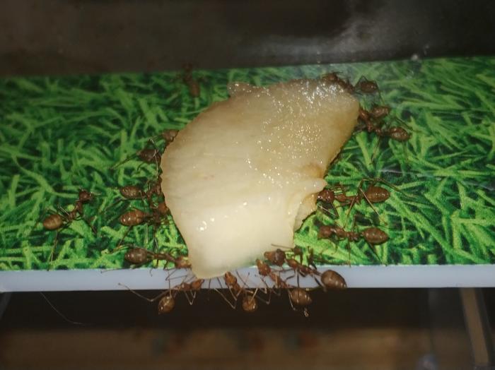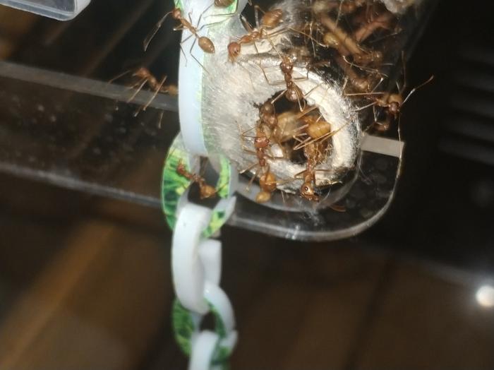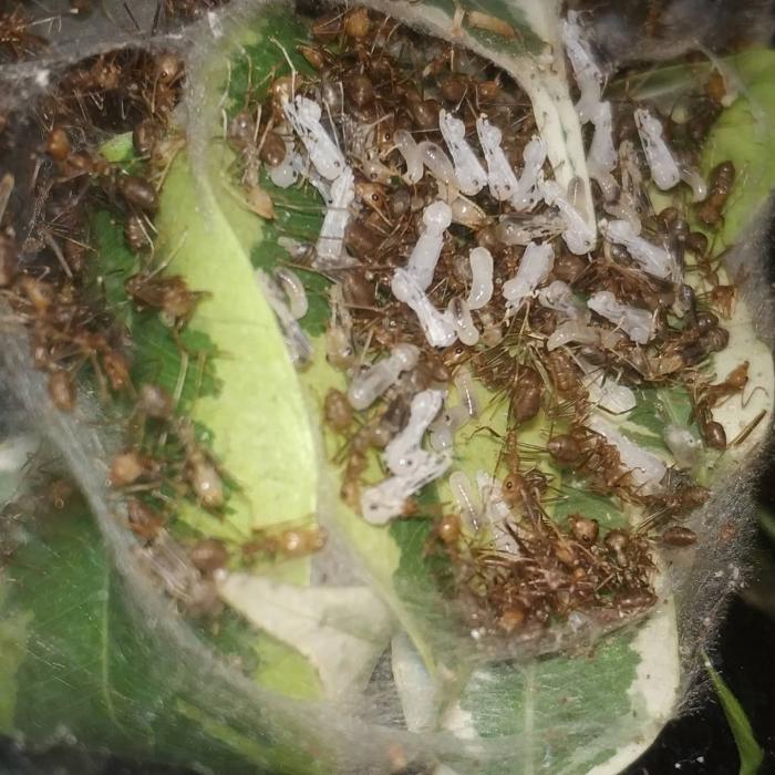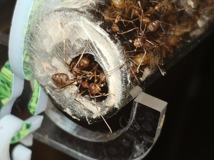 начну со слов благодарности . спасибо огромное Dr. Zoidberg за супер мамашек из Малайзии ,купил у него не только экофил но и псевдолазиуса (вроде как он) и мирмекодия с крематогастерами внутри.ну про все по порядку. матка экофил кажется мне крупней тех что были до этого и ее цвет полностью зеленый без оранжевых или коричневых вкраплений.так же она более активная нежели ее предшественницы .по приезду домой поставил баночку с ткачами на арену к которой подключил пробирку с влажной ватой.при мне покушала и матка и рабочие,как сироп так и таракана.после чего матка забаррикадировалась внутри пробирки и заплела вход в свое новое гнездо шелком .ее 3 рабочих бегают по арене все время в поисках еды=)да и рабочие тоже отличаются по цвету от китайских собратьев они ярко оранжевые,а не коричневые. за ночь появилась приличная кучка новых яиц,те которые были с ней тоже подрасли=) фотографии чуть позже.