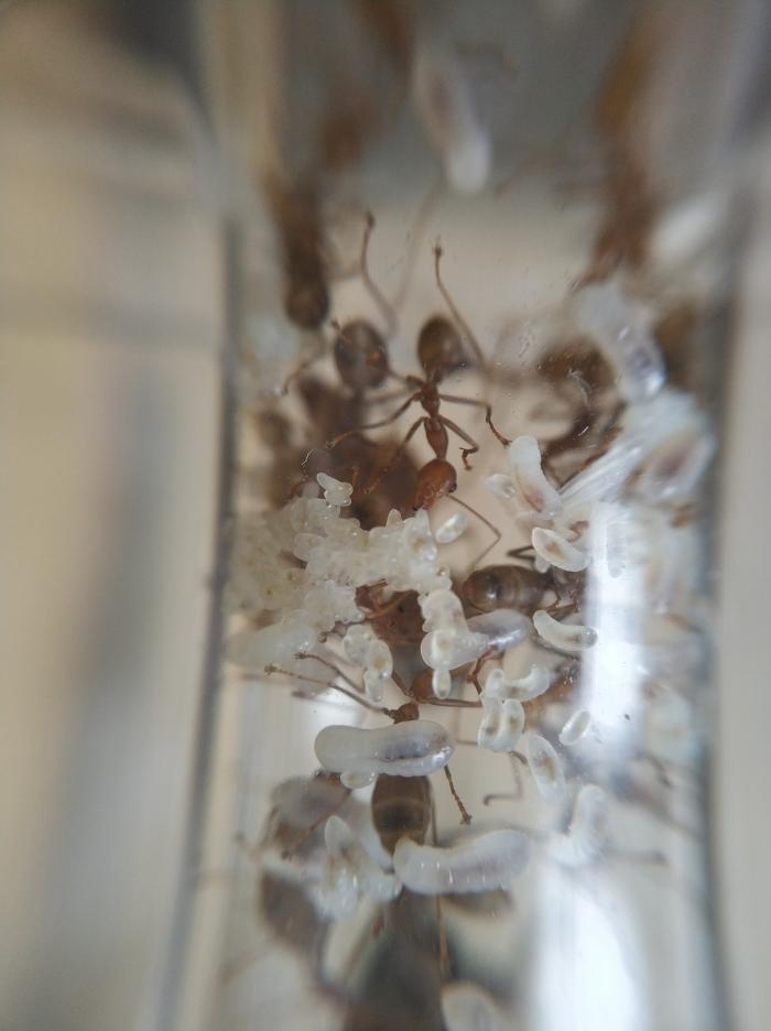 Про развитие могу сказать следующее - по видимому яйца она откладывает волнами. ибо вся куча куколок уже ожила и осталось небольшое количество еще не оживших рабочих 5-10 ну и 5-7 личинок. Из всей горы остались только мелкие яйца, которые она относительно недавно снесла вновь. Получается матка сначала вырастила основную группу и теперь на очереди новые яйца для превращения в новых куколок. На первый взгляд новых яиц не очень много , но при детальном рассмотрении не меньше 30-40(сделаю фото позже). Жду новый формикарий для промежуточного содержания.Месяца на 3-4 пока семья не окрепнет. После переселю в биотоп который уже для меня подготавливает хороший друг=). по кормежке всегда одно и то же- сироп медовый и тараканы.