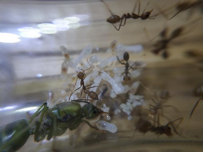 Увы тлю они поели . Семья очень медленно развивается . Хотя кушают очень хорошо .расплода мало,однако уже появились крупные рабочие . +-40 голов.
