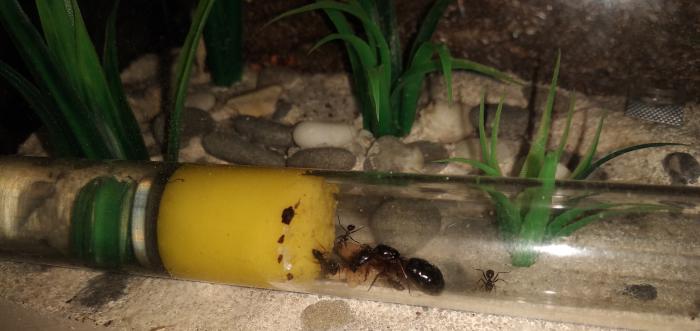 Тёзка, у Вас довольно крупные мураши, сделайте им поилку под сироп из блистера от таблеток. Будет практичней, удобней и вместительней. Ну, это так, совет :) Сам пользую.