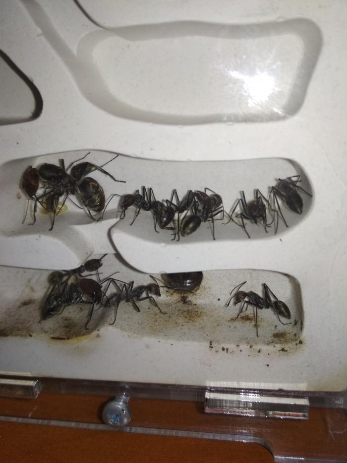 У формика при получении отсутствовали некоторые болты, заменил своими нержавейками, благо подошли. Щели, если плотно затянуть гайки, не появляются, но тогда и вентиляции не будет. У меня гайки ослабленны так, что акрил чуть отходит и образует щель. Небольшой плесневый налёт есть на полу первого этажа, он уже активно поедается ногохвостками, так это не проблема. Матка чувствует себя хорошо, в данный момент есть 2 очень крупные личинки и около 5 яиц. Кушают при мне неохотно, тараканов не очень любят.