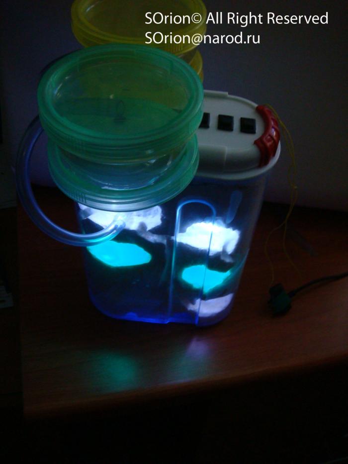 Об идее со светодиодами на этом сайте первым поведал я, а реализовал ее еще лет эдак десять назад, это так, погрею свое эго, использовал тогда обычные красные, сверхярких тогда еще и небыло.. Что касается синих светодиодов то они выполнены из чего то наподобие оргстекла как и большинство других, а пластмасса это не силикатное стекло и в данном случае не известно пропускает ли оно ультрафиолет или нет наличие которого можно допустить