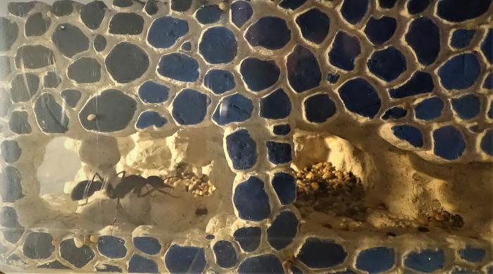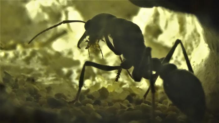 Итак. Вот прошло уже почти 8 месяцев с того момента как у меня появилась моя красавица. Честно говоря, я уже почти к ней не заглядываю. Как минимум месяц я не смотрел, что же творится в гнезде. Ну да, не самым удобным я его сделал. + Так вышло, что где то месяц я её не видел на поверхности. Кормлю, убираюсь изредка. Вижу, что она жива по следам её жизнедеятельности (заваливает поилку песком), но вот на поверхности вообще не наблюдал очень давно. Буквально, минут 10 назад, решил заглянуть в гнездо, включил фонарик и стал разглядывать камеры заваленные песком. Справа ничего не увидел... Камеру слева, тоже вначале плохо просмотрел. Вернее увидел кончик брюшка матки, подсветил с другой стороны и... Чуть было сердце не ёкнуло! Я увидел труп? Неее, я разглядел живую матку сидящую неподвижно и особо не реагирующую на свет. Думаю, что такое? Куда она смотрит... И в уголке, в глубине камеры я разглядел яйца!!! Точно не пощитал сколько, 2 или 3. Но наконец то! И года не прошло. Пока фото выкладывать не буду ибо сложно гнездо подсвечивать, что бы фотку сделать. Да и не к чему её тревожить пока.