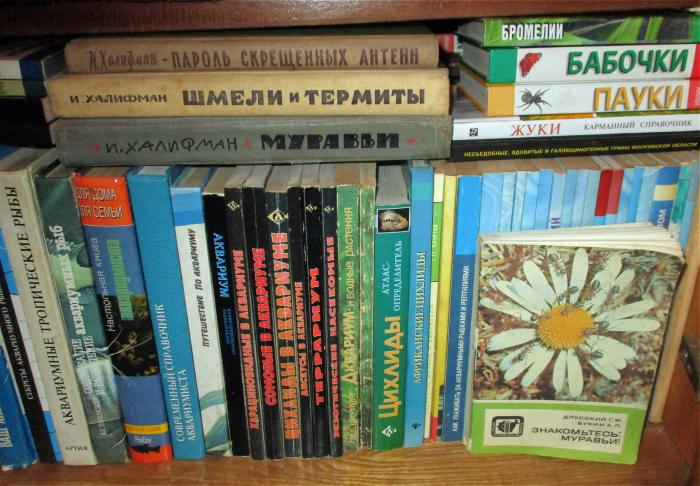 На самом деле таких полочек много, причем на каждой книги в два ряда, а это только третья часть одной полки. Книги (и журналы) накопились за долгие годы увлечения живой и неживой природой и самообразованием.