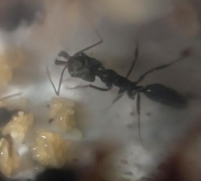 Прибыли ко мне 16 октября 2018 года в количестве 16 штук с яйцами. Сразу с воодушевлением начали дохнуть. Переехали в "понерина-хаус" под светом софитов за два дня. За неделю акклиматизировались, сократив свою численность до 12 и начали активно растить личинок. Сейчас в семье около 30 взрослых особей, плюс немного расплода на разных стадиях.