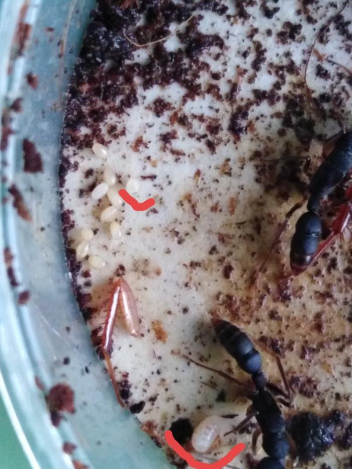 А так же они выбросили самый первый кокон на мусорку, я его вскрыл, и там был ещё белый рабочий... В итоге остаётся, один кокон самца + один кокон матки, 2 личинки, штук 15 яиц.