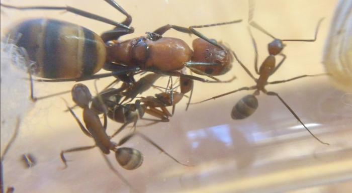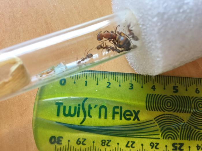 Как и обещала, перефотографировала матку. В этот раз держала линейку уже на уровне мурашей. Размер все-таки поскормнее)) 13 мм примерно получается. В целом колония развивается неплохо. Недавно видела штук 15 яичек, едят хоть и не очень активно сахарный сироп и личинки знахаря. Кормлю их раз в два дня - капельку сиропа даю обязательно, а знахаря подкидываю через раз. В последний раз знахаря не съели, но это может потому что расплод пока не нуждается в белке так сильно.