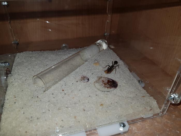 Совсем недавно сбылась моя мечта. Я купил Myrmecia pyriformis, но как некоторые определили ,что это myrmecia forficata. Пришла королева с Австралии, с сайта Antkeepingdepot. После вскрытия посылки были обнаружены яйца, их было 5 штучек. В данный момент матка находится в пробирке с ареной и песком. У нее всегда есть вода в ракушке, также даю ей сироп 1 к 3-4. После приезда дал ей туркменского таракана, мирмеция оторвала голову таракану и немного "поела".