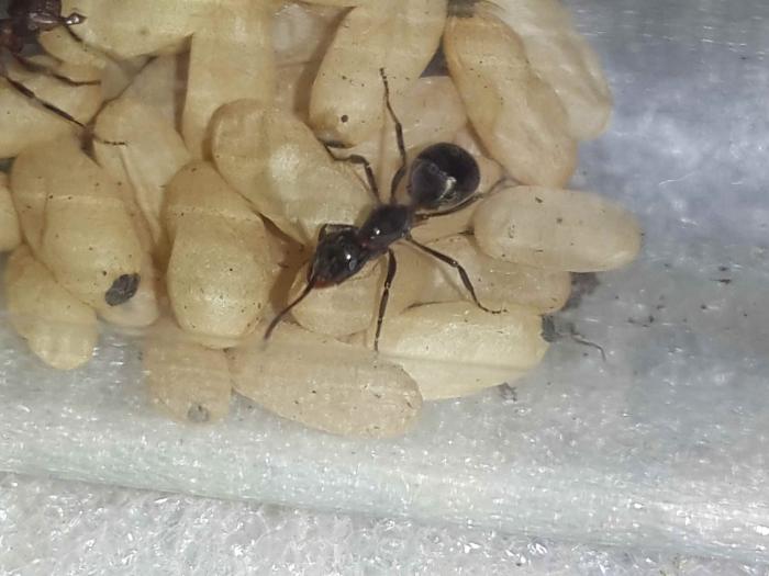 первая матка, та что мельче размером 5 мм, *pressilabris?*, когда видит что ее хотят перенести складывает лапки и выпрямляется в форме палочки в то время как тех маток что крупнее 7мм,*foreli?*, переносят только стандартным образом в виде чемоданчиков, либо просто ведут за жвалы в точку назначения .