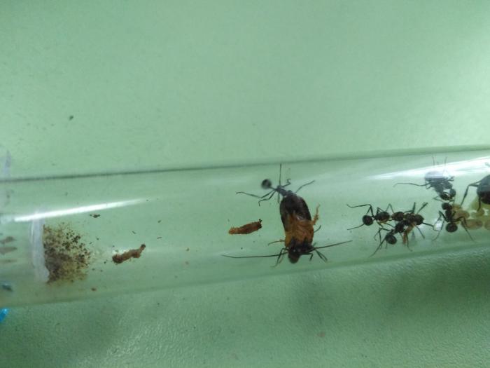 Пару дней назад, было боевое крещение моих мирмикарий. В составе 13 особей, они самостоятельно поймали сантиметрового туркмена, пусть, и на маленькой арене.