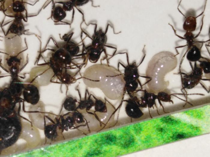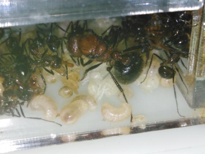 Попытался самостоятельно отыскать информацию о типе поселения этих муравьёв в естественной среде обитания, но не преуспел. Возможно ли, что типом поселения является поликалия с расплодными гнёздами? Дело в том, что у многих видов муравьёв личинки старших возрастов угнетают яйценоскость самки, а присутствие самки, в свою очередь, угнетает развитие личинок старшего возраста. Эту проблему решают расплодные гнёзда, в которых достигается эффект "физиологического отсутствия" самки. Т.е. может быть, им через арену (для пущего эффекта "раздельности") подключить совсем небольшой модуль? С другой стороны - к реализации подобных схем переходят лишь семьи достигшие взрослого состояния (обычно). Я бы попробовал - вдруг развитие расплода ускорится?