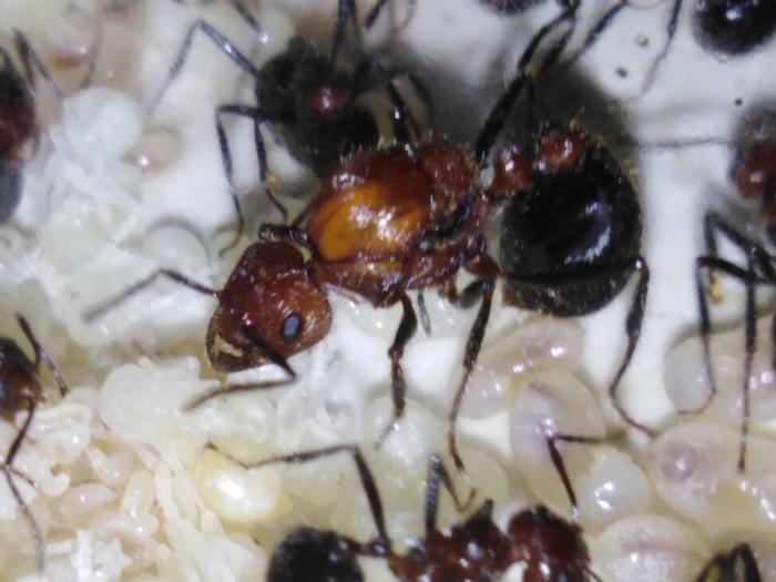 Матка приехала с парой личинок и пакетиком яиц. Очень понравилась её окраска, бордовая голова и грудь в сочетание с чёрным брюшком. Именно поэтому я сравнил её с гвардейцами "красного" кардинала Ришельё. Так же пленила её необычная походка с подогнутым брюшком, но иногда она распрямляется и кажется очень вытянутой.
