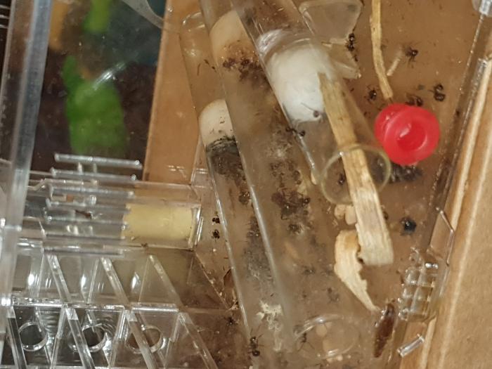После просмотра информации по данному виду, я решил завести их себе, пришла мне матка и 1 муравей зимой этого года, далее все было хорошо, я их регулярно кормил насекомыми, поил глюкозой, колония росла, и после достижения количества 1х100 я решил их пересадить в новые покои, жили они на тот момент уже в 3 пробирках: