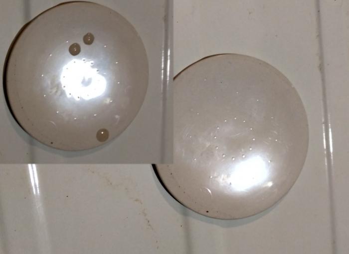 На образце отливки видна глянцевая поверхность и капли воды. Образец отливался в крышку от одноразового контейнера.