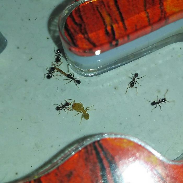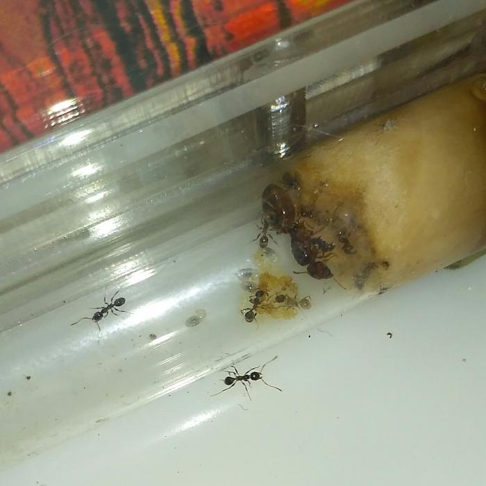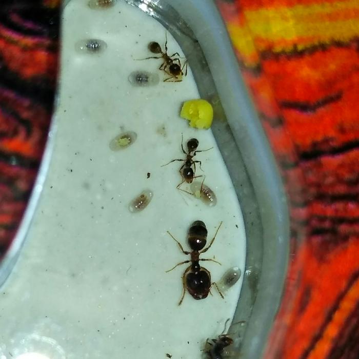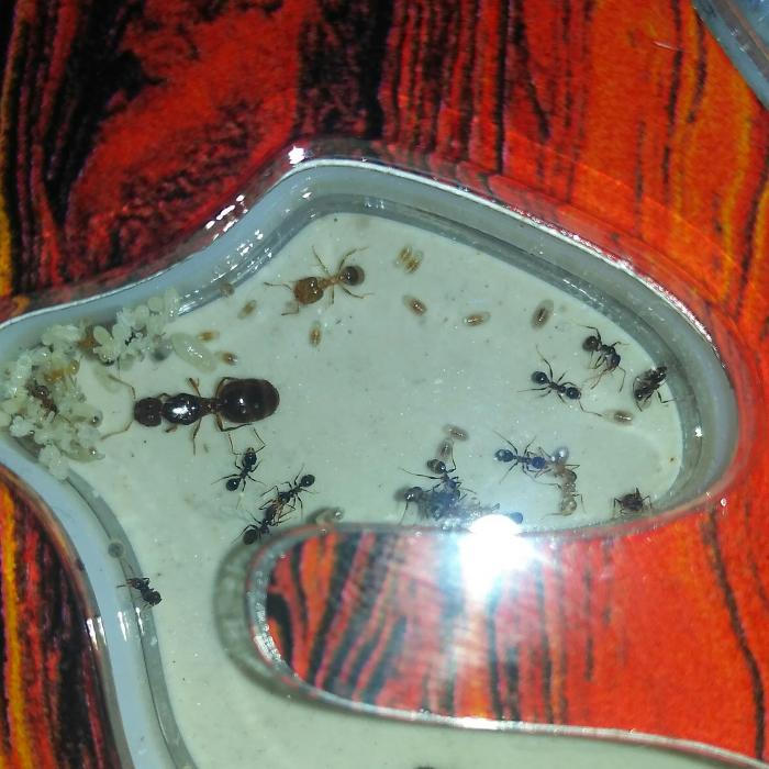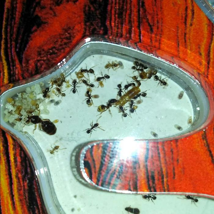 Самая идеальная муравьиная семья из всех, которых я содержала. Развитие идёт быстро и без проблем, уже появился первый солдат. Расплод, кроме крупных личинок, большую часть времени находится на верхнем стекле. Личинки питаются сами, часто вижу кусочки еды на них. Каждый день колония поглощает большую личинку знахаря, перемалывают все до крошек. Очень любят семена кунжута)