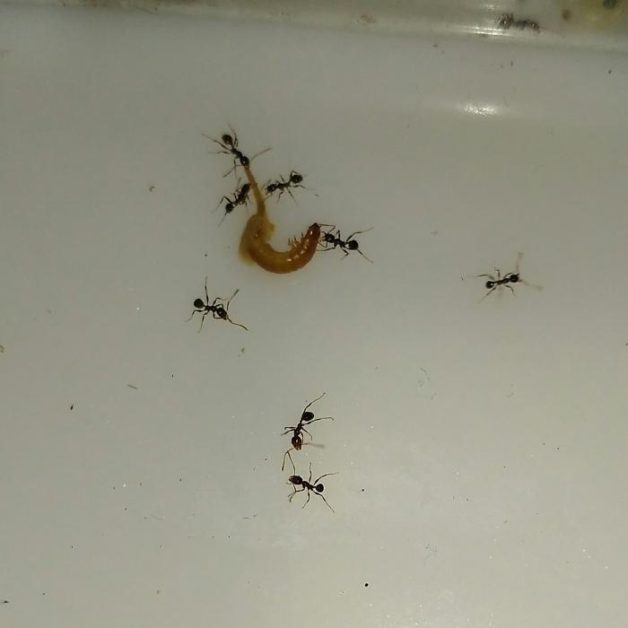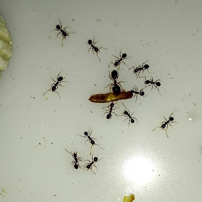 Новые муравьи появляются каждый день и справляются с более крупной добычей, как и с мягкими семенами кунжута. У второй матки рабочих и расплода меньше, поэтому стараюсь часто не тревожить и давать больше белка.