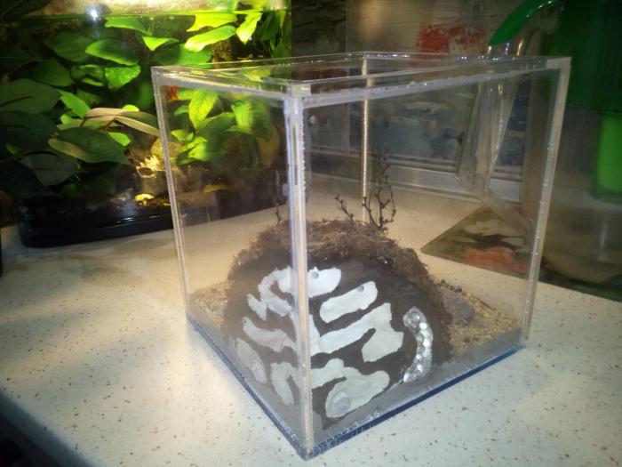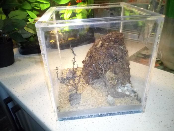 Идее уже с год, наверное. Акриловый (или стеклянный - разные варианты рассматривались) куб-арена, прямо внутри которого отлит усеченный дважды по вертикали конус - имитация муравейника. Со стороны арены покрытый какой-либо мелочовкой (мох-сфагнум, кокосовая крошка, хвоя) на ПВА, а на прижатых к стеклу сторонах - внутренняя структура - камеры формика.
