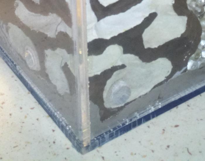 1, 2. Порезал из акрила 5 мм (расточительно, хватило б и трех, но у меня коты, поэтому хотел помасивнее, потяжелее, антипереворачиваемый) две развертки куба 20х20х20 и 30х30х30 см, пробовать начал с меньшего (дкмается, бОльший выйдет покрасивее - больше пространства для украшательства арены). Клеить буду диэхорэтаном. Соорудил приблуду из остатков полочки - прямые углы при поклейке держать, стартанул. Держит божественно, монолит.