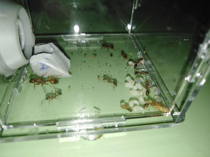 Сразу по приезде я переселил семейку в новый инкубатор и подключил арену. Пока в комнате горел свет, муравьи тихо сидели в углу, выключил и через 7 мин все уже в пробирке. Как ждали.