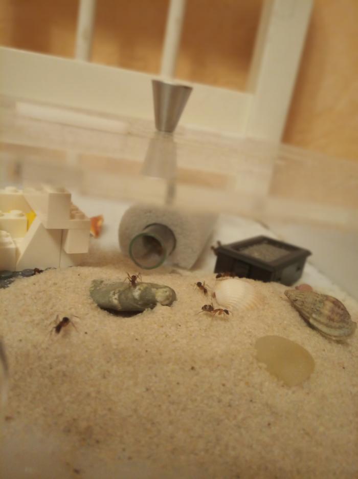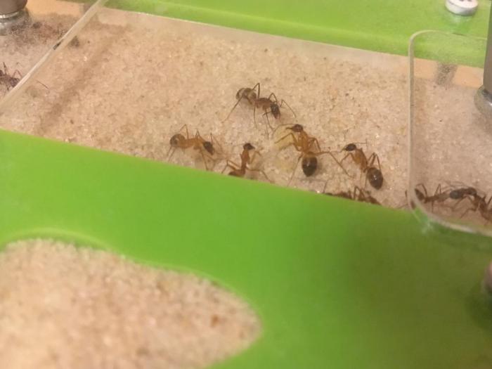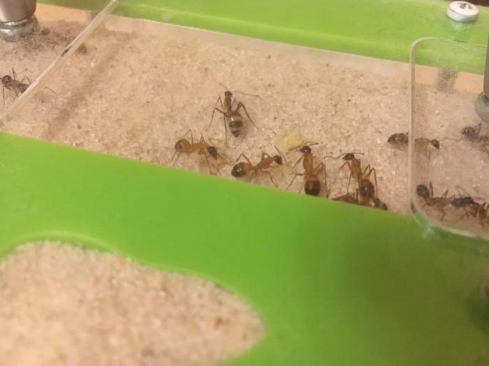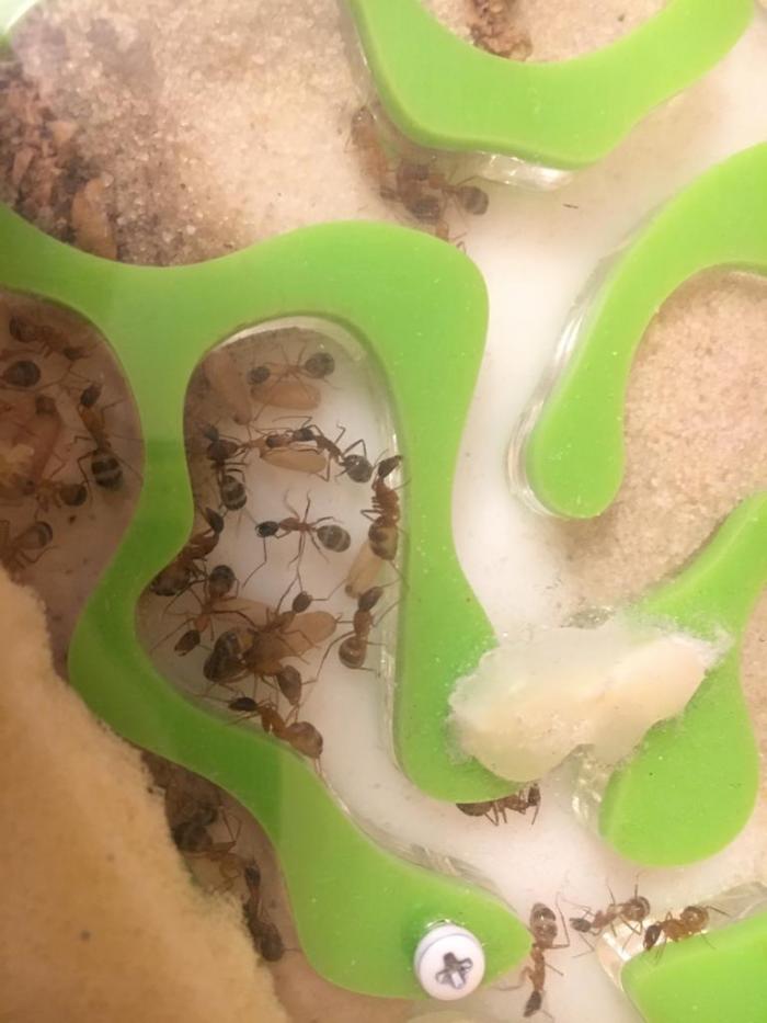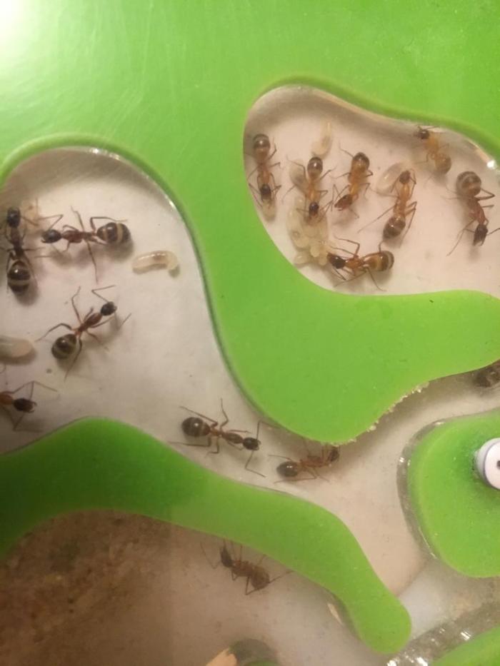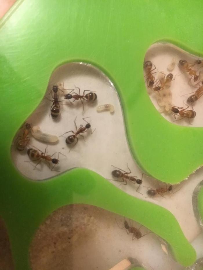 История эта началась, в феврале. Тогда из офиса антпланет, счастливый я ехал домой с пробиркой в которой находились матка и 12 рабочих. Через какое-то время их стало 17+-, и я поставил пробирку на арену, и включил подогрев (как всё выглядело видно на фото). Время летело, а феллахи не очень то спешили развиваться. Наступило лето, а их было около 25. В течение Июня я стал увлажнать песок, и избытак рабочих постояно там жил. Несколько старых робочих дожили свой век и были утилизированы. Тем временем я их активно кормил комарихами, время шло и когда я понял что их около 30, я решил заселить их в формик от антпланет, а это было в конце августа.( на фото переселения видна лишь 1/3 рабочих) Семья росла и щас их около шестидясети особей. Но, не так довно в первых числах Ноября я обноружил что яйца высыхают не дойдя до личиночной стадии. На данный момент я считаю что это из-за увелеченния времени подогрева арены, раньше я подогревал около 10 часов, а когда начались проблемы я подогревал около 17 часов. По ощущениям там было примерно 30-33 градуса. Так как яйца вытаскивали погреться в месте с кококонами появилось предположение что они просто перегревались. Но потом я идеот догадался подсвечивать яйца с помощью лупы, думая что свет от ламп не навредит. Я пытался менять влажность, отправил на зимовку, но не что не помогло. Сейчас я предпологаю что именно подсветка лупой была ошибкой, зная что яйца чувствительны к окружающуй среде, и то что на свету в природе они не бывают, я решил что подсветка была моей ошибкой. Сейчас точно не скажу причину, но больше я не наблюдаю смерть яиц. Ну чтож, на данный момент у них есть кладка яиц в которой не все яйца здоровые с времённ подсветки лупой. А теперь хорошее, хотя расплода стало значительно меньше, из старых коконов появились две переходные особи ( если я правильно называю недо-солдата и пере-рабочего). Матка сейчас отдыхает хотя иногда несётся. Яйца же радуют своим заметным развитием. Скоро будут фото охоты расплода и тд.