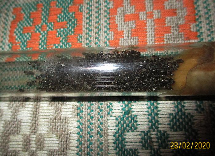 Матка зимовала хорошо, в пробирке. Ватка внизу - были вынужденные меры достать матку, чтобы было удобнее выполнять с ней манипуляции. После зимовки она чувствовала себя хорошо, но позже семья будто вымерла. После зимовки она была переселена в небольшой гипсовый инкубатор. Увлажнялось. Сироп давала, белок - нет.