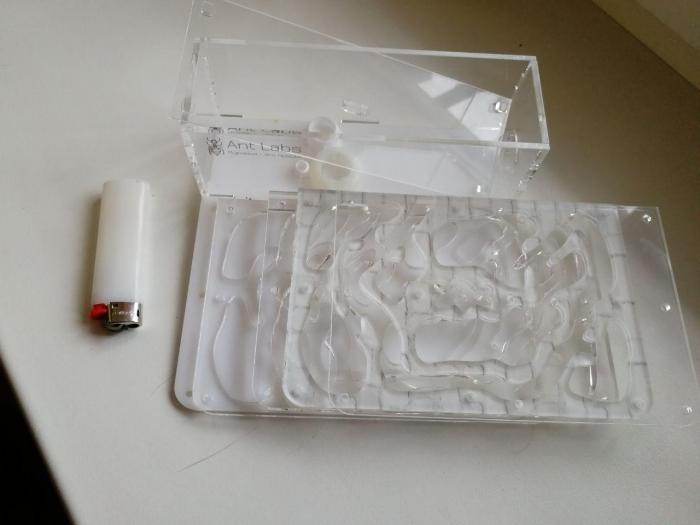 Вы можете посмотреть как он выглядит новый если погуглите "Акриловый формикарий AntLabs "Start" Белый камень", а я приложу фотографию своего.