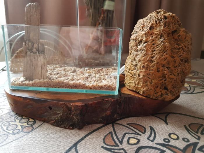 Общий размер~20*10*10 см. Подставка из черешни с бронзовой смолой, силиконовые ножки, арена-стекло крепится винтами, гнездо из гипса 7*7 см, камера увлажнения, ходы глубиной 12 мм.