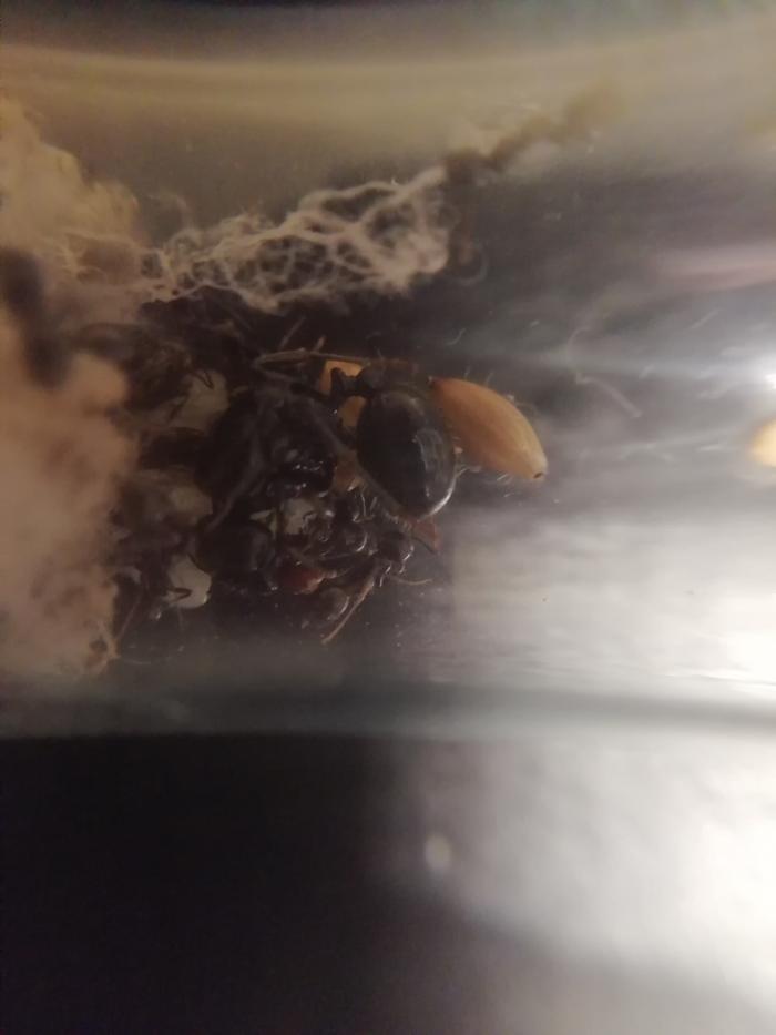 Переезд пережили хорошо, есть личинки и куколки, насчёт яиц не скажу, так как на расплоде всегда 70% колонии, и разглядеть что либо в подробностях трудно.