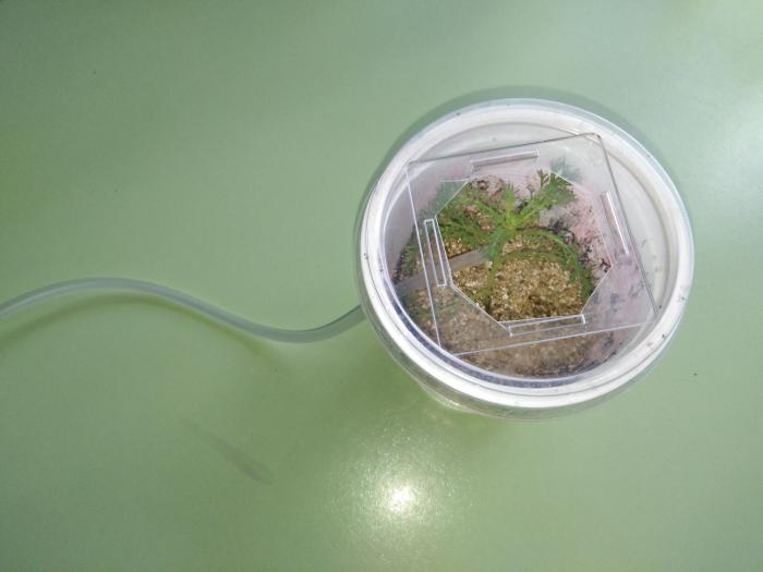 На выходных я обнаружил большое гнездо тетрамориумов с соляриями под камнями. А из под них росла самая обычная трава, составляющая основу дёрна. На ней находилась крупная белая тля, оберегаемая тетриками. Я поместил её в пробирку с влажной ватой, кормовым растением и забыл на два дня. А вчера обнаружил расплодившуюся немного тлю. Правда, вскоре в пробирке выпал конденсат, и осталась только одна крупная особь. Сегодня я пересадил её вместе с успевшей появится ночью одной мелкой в новую пробирку. Конструкции вы можете увидеть на фото. Это пробирка с влажной почвой и растением, обмотанным ватой. В будущем конструкцию нужно модернизировать - вата в скоро начнёт портиться, а растению будет мало места, но на спасение тли мне хватит, а там посмотрим. Надеюсь, что скоро численность восстановится!
