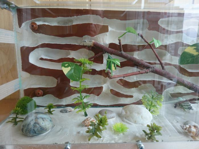 В ракушку-кормушку насыпали еды. Поставили поилку. И соединили трубкой формикарии...