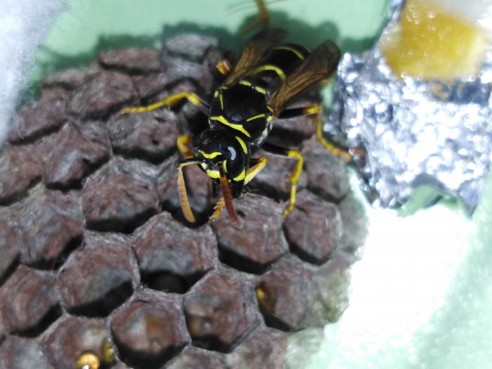 Полистесы оказались крайне миролюбивыми созданиями. Обе самки, пусть и с разной смелостью и спокойством, берут корм с рук. Это здорово, надо сфотографировать) Кстати, жало они применяли лишь однажды, когда я переселял их пинцетом, ещё не зная фишку с "занятами ртами".