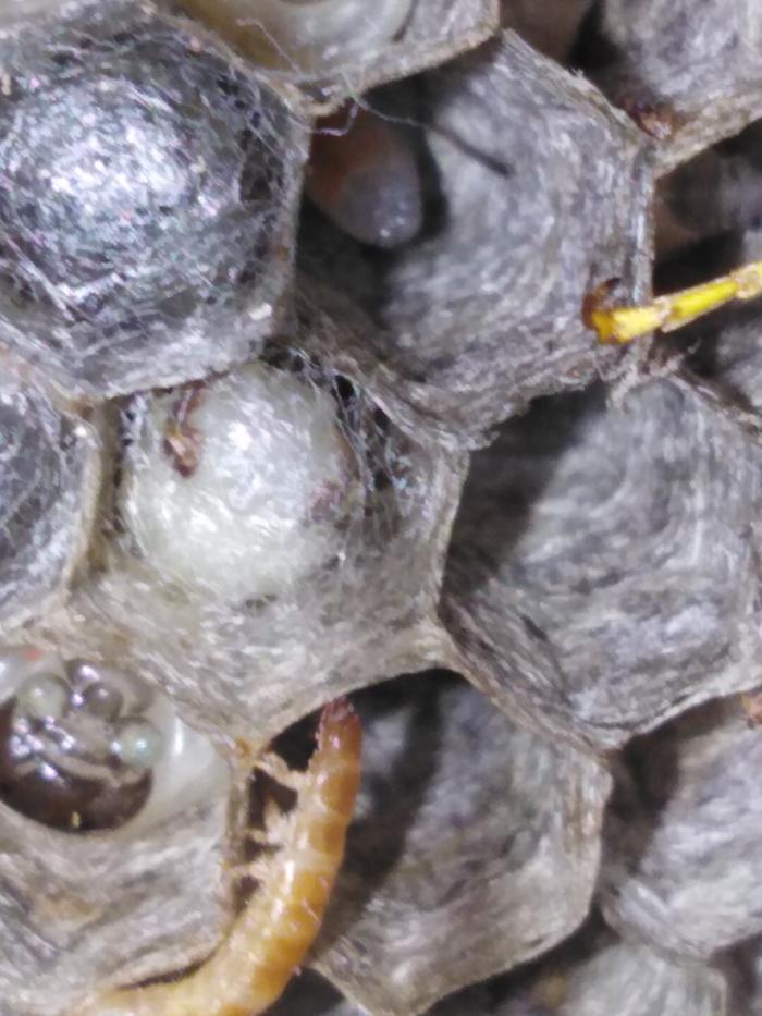 Очень непривычным выглядит расплод ос. Яйца находятся в крайних сотах вместе со сгущенным осами сиропом. Маленькие личинки имеют красноватый оттенок и могут располагаться в сотах горизонтально или вертикально. Более крупные имеют отчетливую голову и находятся в вертикальном положении. Заплетенные соты с куколками находятся в центре гнезда. Кстати, первые рабочие должны появиться в ближайшие дни. С нетерпением жду их появления.