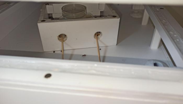 3) жизнь, между тем, движется. Колонию я спровоцировал (повесил на старым формикарием круглосуточную лампочку) и она, колония, в полном составе переселилась. Как ни смешно, но матка облюбовала именно внутренности крана, который ходы переключает - от лишних глаз подальше, видимо. Я, впрочем, не особо против.