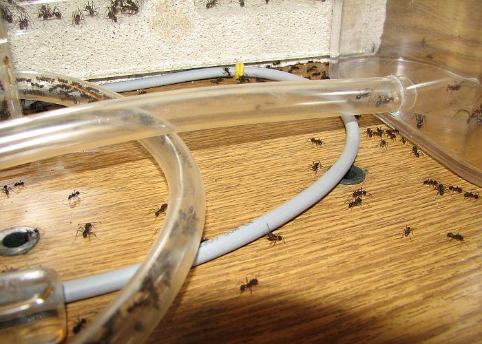Тропический вид кампонотусов способен бегать под водой. Когда я заливаю 4кубика в трубку (внутренний диаметр 6мм), некоторые муравьи полностью залазят в сироп и пьют его, находясь внутри. Я пробовал заливать в эту трубку обычную воду (создавалась водная преграда 5 сантиметров в длину). Кампонотусы без проблем проходили эту преграду, чтобы попасть на арену и обратно, никто из них так и не застрял в толще воды. Через 20 минут часть воды выпили, остальное растащили на своем теле.