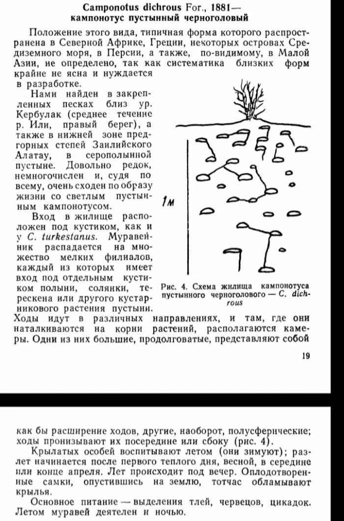 Здравствуйте! Читая книгу П.И.Мариковского "Муравьи пустынь Семиречья" я наткнулся на вид, который называется Camponotus dichrous. О таком виде ни разу не слышал. После прочтения я понял что во многом образ жизни схож с Camponotus turkestanus. Захотелось узнать немного больше об этом кампе. Зайдя в интернет увидел, что данный таксон невалидный, и он оказался младшим синонимом Camponotus thoracicus. И тут я подумал о том как он выглядит. А вдруг я его видел? Прочитав еще немного литературы на немецком и французском, понял что голова у них черная, и задняя часть брюшка тоже черная, или желтовато коричневая. Размер рабочих 6-12мм, матки 16 мм. Я обрадовался, но тут я начал сомневаться. Вдруг Мариковский ошибся, и он спутал Camonotus fedtschenkoi с Camponotus "dochrous". Ведь разрывы в ареале довольно большие получаются.