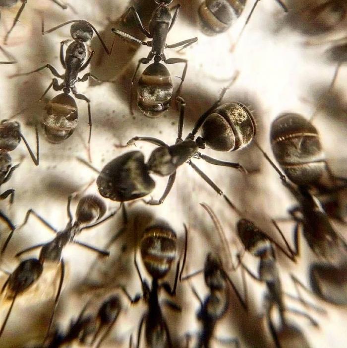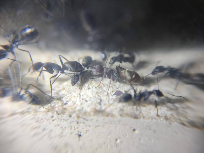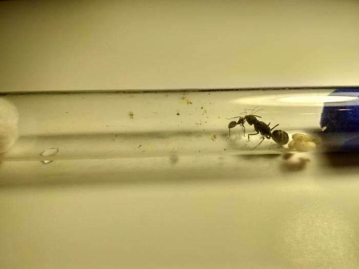 С последнего упоминания об этой семье практически ничего не поменялось. Разве что муравьи стали более охотно кушать. И сироп, и белок. Так же они залепили стенки, поэтому там сейчас мало что можно разглядеть, но матку я кое-как сфоткал, и заметил что не только у одного солдата есть бордовая голова. Есть ещё пару, они по размерам меньшие, бордо не так много, но все же его достаточно легко заметить.