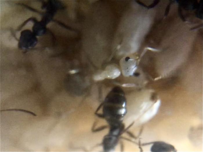 Всем привеееет!!!! Давно я не писал, а вы наверное подумали, что мураши дали дуба. Но на самом деле все хорошо, все живы. Королева все-таки снесла яйца, причем очень много. Жрет колония, как ни в себя. Сейчас стали потихоньку выходить новенькие мураши. это, если не ошибаюсь 4-ое поколение. Их кстати не трогают, как предыдущие, не пытаются убить. Еще в этот раз заметил, что они собрали кучку из ваты от поилки и измельченного хитина, в которой заворачиваются куколки. Раньше так не делали. На счет вида, я более чем уверен, что это пратензисы, ибо здоровяки имеют 2-цветную морфу, а мелкие одноцветную - черную. У пратензисов как раз так. Да и волоски в нужных местах.