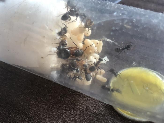 Также в этом году поймал еще одну высшую формику, (теперь уже не берусь утверждать кого конкретно), позаимствовал коконов у моей колонии, и сейчас у нее куча яиц, живут в пробирке с собственноручно изготовленной ареной. Но растут медленно очень.