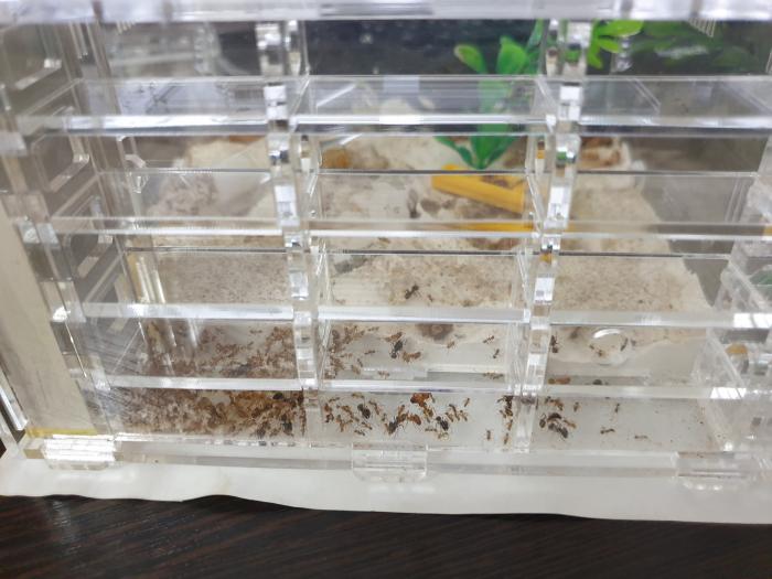 Продам или обменяю Pheidole Indica (чуть мельче Noda) c 2 королевами составом 400+ за 4000 рублей, с формикарием 5000 рублей