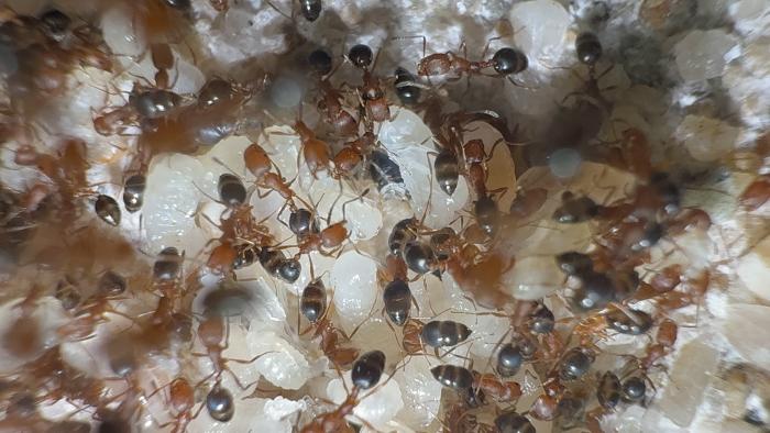 Итак в конце августа мне посчастливилось побывать на Крите, пробыл я там почти 2 недели, за эти 2 недели я успел застать 3 переселения, 1 лёт и кучу муравьев. Но самое классное, что я оттуда привез это, конечно, monomorium bicolor. Это мелкие муравьи, но они будут раза в 2 крупнее фараонов, также они имеют оранжевый торакс и голову, брюшко блестящее, черное. Матки очень похожи на маток фараонов, но так же где-то в 2 раза больше. Также насколько я успел заметить, биколоры имеют жало(так же как и фараоны) и его используют(это конечно не огненные с их жалом, но все же). У биколора также как и у фараонов есть внутригнездовое. Ну и теперь самое интересное. Нашел я их во время деления главного гнезда. В итоге поймал 15 маток и под сотню рабочих. Ловил самым банальным, но самым проверенным способом, ватка и салфетки. Скидывал всех в контейнер промазанный вазелиновым маслом. После переселил всех в пробирку, заткнул ваткой, в пакет с ватой и в багаж. После приезда я сразу переселил их в формик, но из-за того что я не привык к таким магазинным формикам я не справился с увлажнением(а поилку же я конечно не поставил) и 1/3 рабочих умерла. Сейчас семья полностью оправилась, хороший пакет яиц и уже несколько десятков маленьких личинок. Едят мелких мертвых тараканов и пьют сахарный сироп. Так же они очень любят делать запасы как фараоны или кремы, перемолоть все в труху и хранить в сухом месте. Формик стоит под термоковриком что бы не было конденсата. Так же все щели я заклеил скотчем.