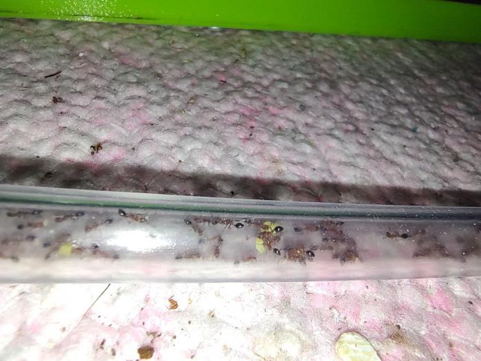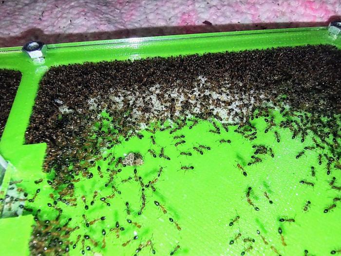 Как же давно я здесь ничего не писал. В общем, да особо и не было что. Семья первая вымерла, так и не дав новых самок. До сих пор не знаю почему, возможно белка не хватало, хоть я и старался закармливать их максимально. НО. Раз я продолжаю этот блог, значит рассказать есть что. При одном из переселений старой семьи. Я решил попробовать отсадить некое количество рабочих и немного расплода. И о чудо, они сумели вывести 3 самок. И эта семья как раз на данный момент жива. Сколько ей я уже не помню. Основная вроде как прожила 3 года. Новой уже года два наверное. И вот только сейчас они соизволили вывести крылатых. Уже бегают несколько самцов. Самки пока лежат куколками, но уже две я точно видел. Это очень радует. Эта семья за лето пробовала раза 4 вывести крылатых, но всегда съедала все крупные личинки. И только когда я начал давать им каждый день по таракану, они сумели довести личинок до куколок. Где-то через недели 2 я думаю сможем увидеть результат. А пока несколько фото. На последнем слева можно увидеть куколку самки, а справа самца