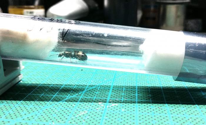 Сейчас она "сидела" удачно и получилось её запечатлеть для "будущих поколений". Судя по предыдущему рисунку она похожа на Formica cinerea. Вот, нашёл описание в одном из наших магазинов: Гибернация: да, с конца октября до конца марта при 5-8 ° C. Formica cinerea - активный, очень агрессивный вид, который, приспособившись к открытой среде обитания, обладает прекрасным зрением. Более крупные хищные насекомые часто отлавливаются взаимодействующими группами и доставляются в гнездо. Размер: ок. 12 мм. Цвет: черно-серый с серебристым отливом, ножки красноватые. Очень теплолюбив, живёт на песчаных почвах (берегах рек, опушках), однако, как правило, быстро используют муравьиную кислоту. Так и есть, это об использовании кислоты. Если мушку даю, набрасывается и заворачивает брюшко к жертве. Смотрел под 10-кратным увеличением - ножки и правда красноватые. Правда это не показатель. Какие будут советы по сохранению и "входе" в зиму? Расплода нет. Думаете погибнет?