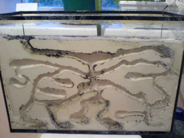 Как видно на фото, камеры - это удлиненные соты (кстати, об удлиненных сотах в своей идеи я не писал, решил это сразу написать в этой теме), а ходы - это классические ходы, как у многих наших формикариях - углубления в наполнителе. Это, можно сказать, сочетание моей идеи с классическими. В низу алебастровой отливки имеется горизонтальное сквозное отверстие для увлажнения, которое я смог сделать с помощью пластиковой трубкой при отливке. Камеры я делал из картона. Ходы - из пластилина. После застывания, пластилин и картон вынул, а трубку нужно вынимать аккуратно после полной просушки.