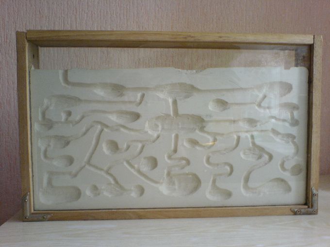 (волнистости возникли от бумаги; я к ней приклеивал картонные камеры и пластилиновые ходы; в следующий раз такого делать не стану, буду крепить сразу к стеклу)