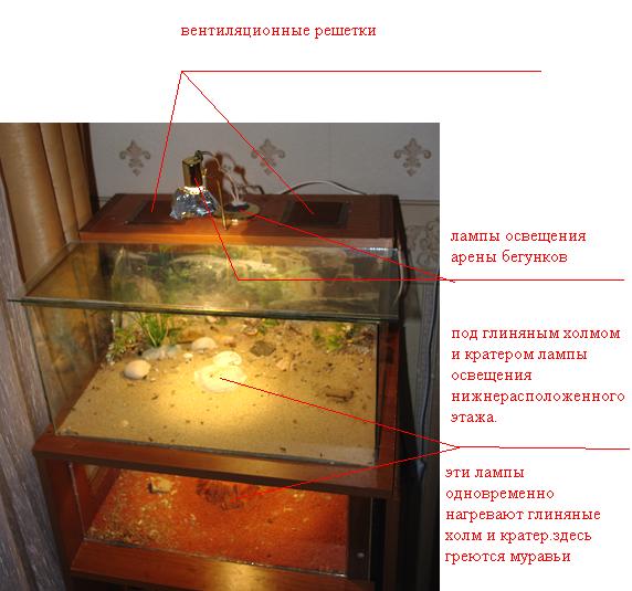 Формик сделан для двух семей, независимая подсветка каждой колонии, включаемая и выключаемая тумблерами расположенными в крышке, также отдельно включается подсветка воды (увлажнение сделано как у Горыныч'а) Арены соединены с формиком через трубки сделанные из гидроуровня...
